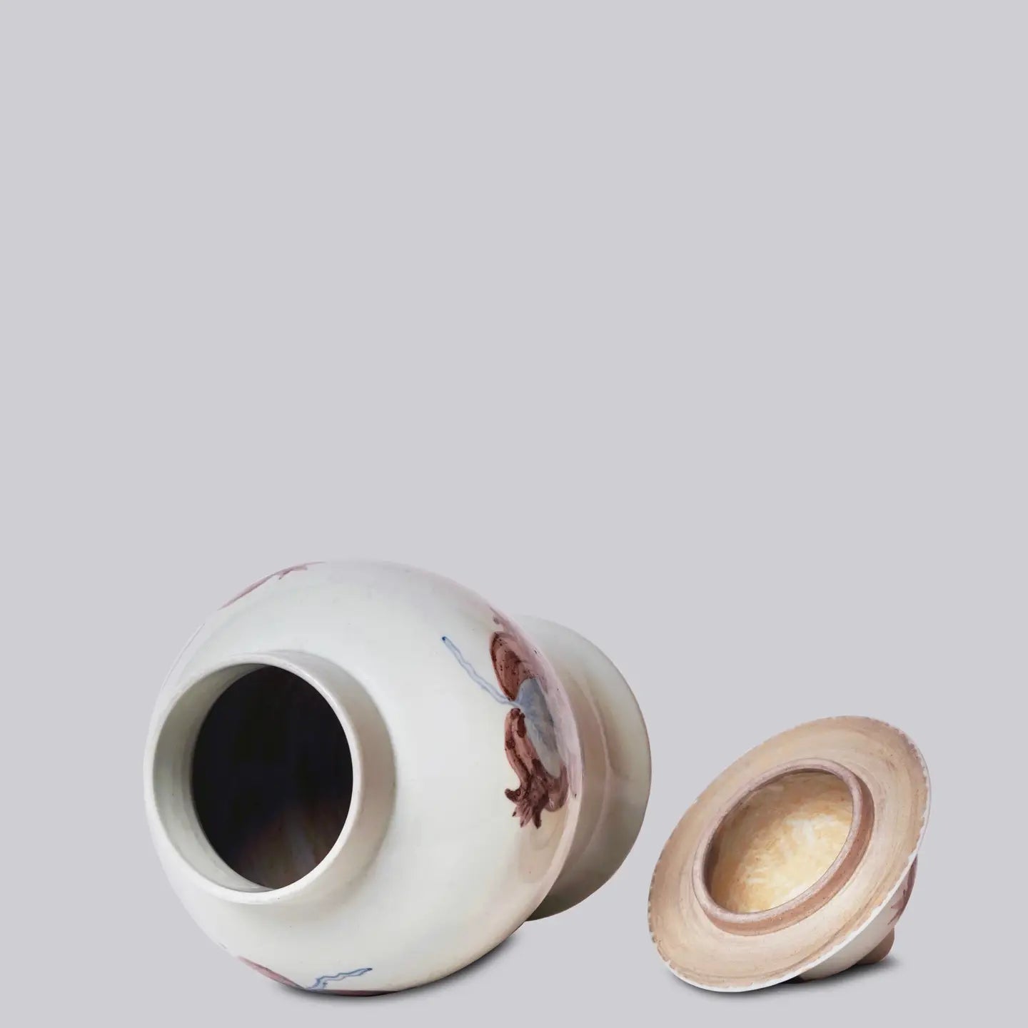 his wheel thrown piece is a temple jar with hand painted decoration featuring an auspicious pomegranate, a symbol for plenty.